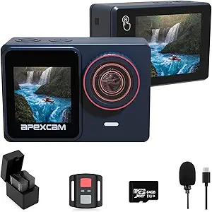 Apexcam Action Camera 4K with 64GB Card, HD 60FPS 48MP Sports Camera for Vlogging, 40M Waterproof Camera Underwater, 170 ° Wide Angle WiFi Camcorder, 8X Zoom, Remote Control, Helmet Mount Accessories